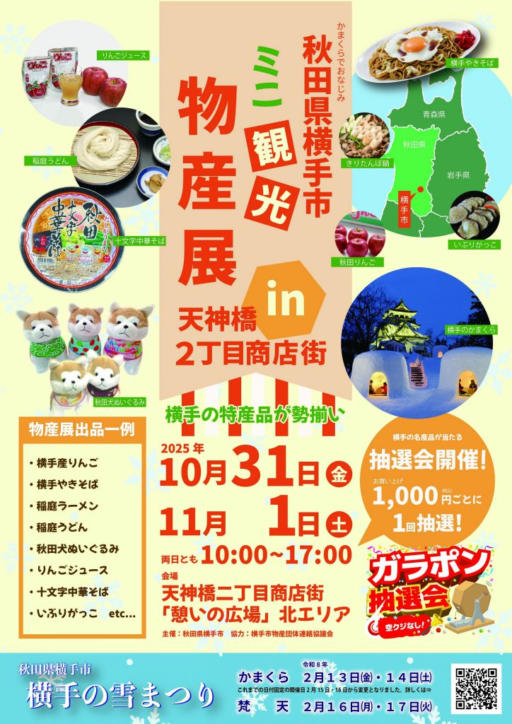 秋田県横手市ミニ観光物産展(天神橋2丁目商店街・2025/10/31~11/1) 2025年10月18日 最終更新日時 : 2025年10月18日 wpmaster 「天神橋2丁目商店街」で秋田県のPRイベント開催 2025年10月31日~11月1日の期間「天神橋2丁目商店街」で、秋田県横手市のPRイベントが開催されます! 秋田の美味しいものたくさんあります、是非現地までお越しください! 【日程】 2025年10月31日~11月1日 10:00~17:00 【場所】 天神橋二丁目商店街「憩いの広場」北エリア (南森町駅 3番出口すぐ)