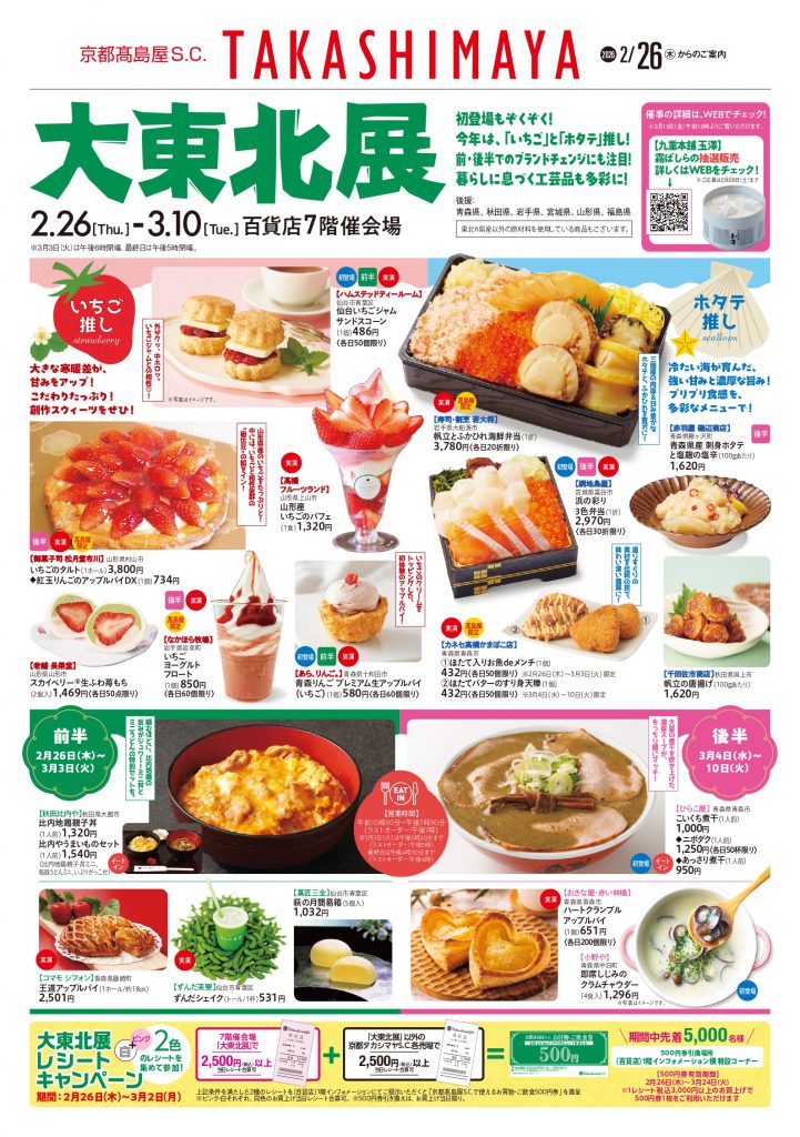 大東北展(京都高島屋・2026/2/26-3/10) 2026年2月20日 最終更新日時 : 2026年2月20日 wpmaster 京都高島屋に東北6県のおいしい名物と工芸品が大集合! 初登場もぞくぞく! 今年は、「いちご」と「ホタテ」推し! 前・後半でのブランドチェンジにも注目! 暮らしに息づく工芸品も多彩に! ▼クリックすると詳細・裏面もみることができます 【日時】2026年2月26日~3月10日 【場所】京都高島屋 7階催事場